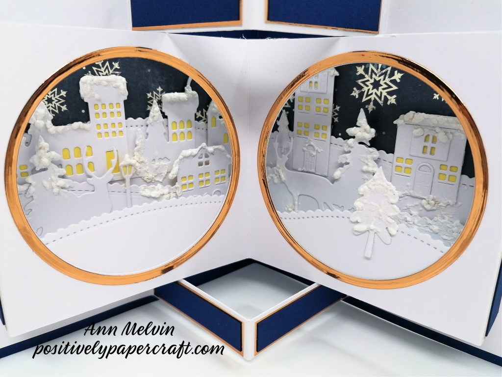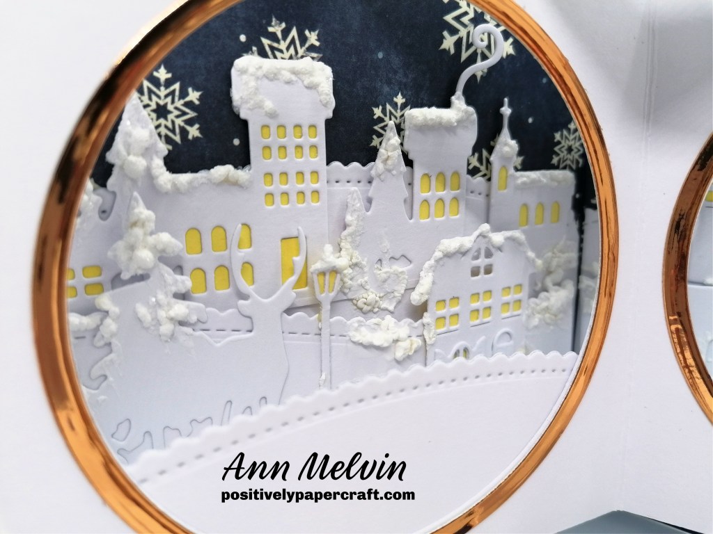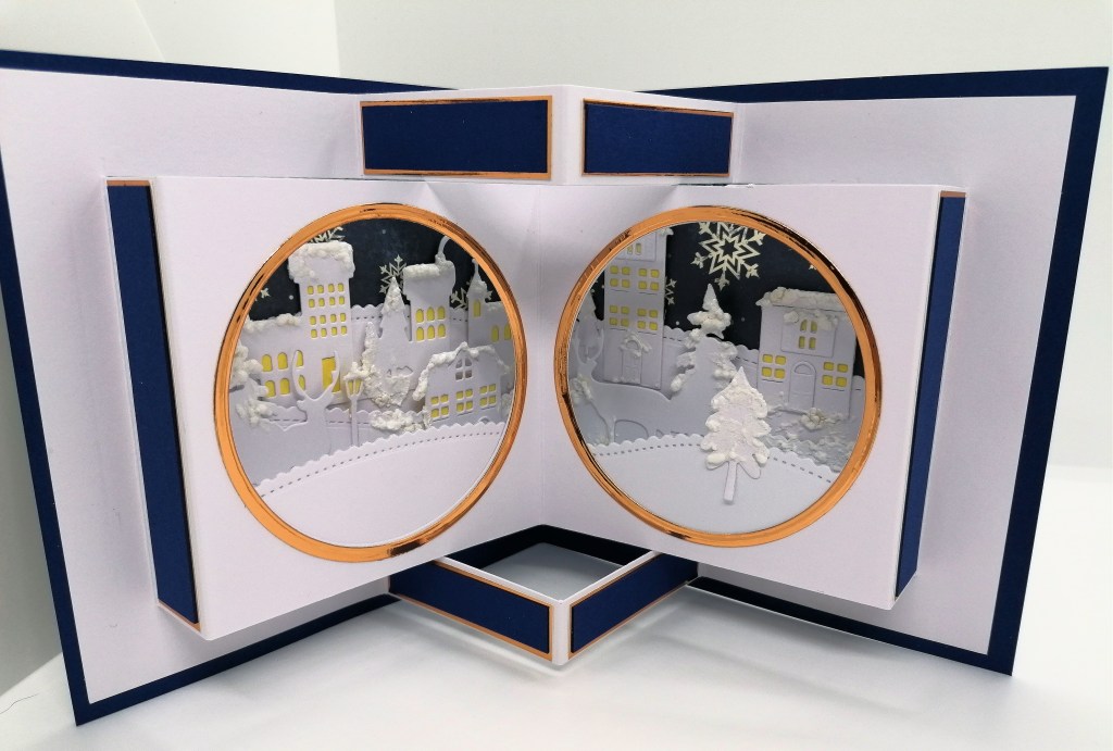 I made a pop up back card about 4 years ago on my Youtube channel. Its the same concept but I have added a 3D element to it. Normally you would just stamp a design on the ‘book’ part but I have cut circles out and added my Christmas village/scene inside.