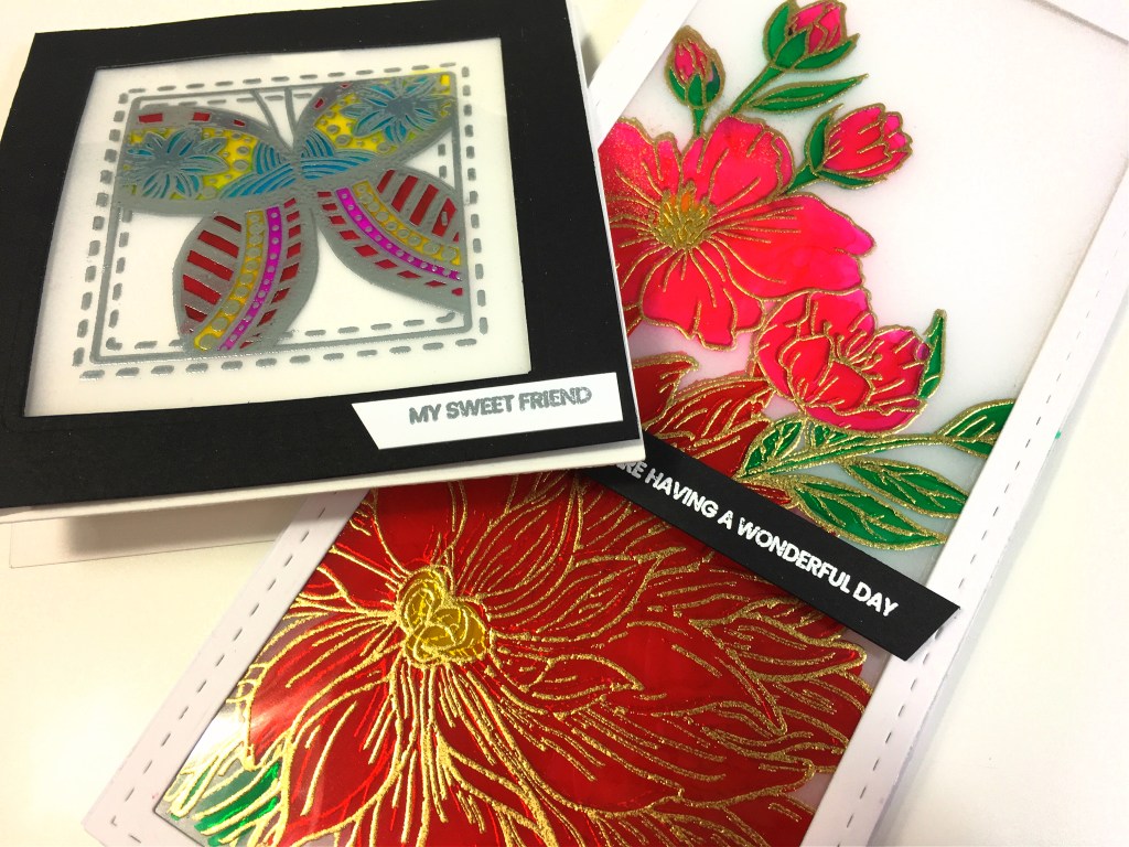 The great thing about this is you can use any stamps that you have in your stash. As long as you have heat resistant acetate and vellum then you can have fun creating with your stamp sets. You also need a few alcohol markers. You can also use any colours you have and see how they turn out. I think it gives a stunning effect.