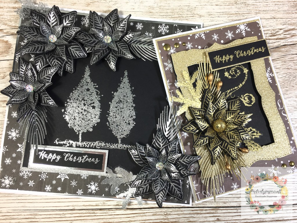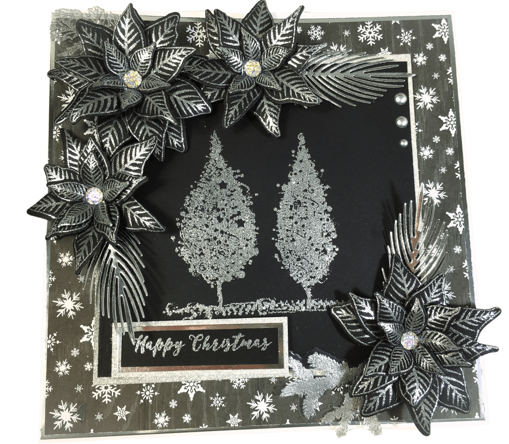 The photograph really does not do this card any justice! It’s so much more sparkly and glittery in real life. I think I am in love with the Black poinsettia flowers. I love the sparkly Tree’s stamp set as it gives ‘extra’ sparkle.