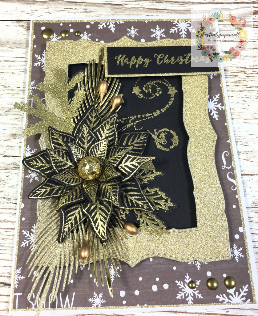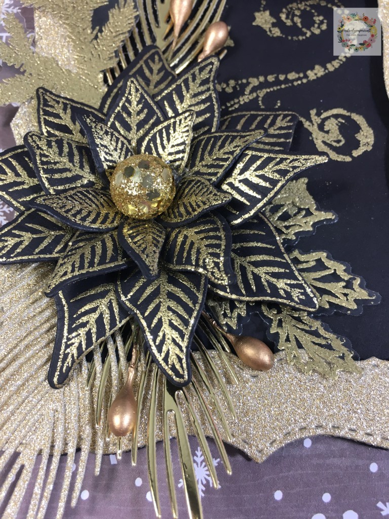 The poinsettia stamp and matching die are from Chloe’s creative cards as are some of the sprigs and leaves. They seem to be sold out though. I used a large glitter berry for the flower centre and also decorated with some large stamens. The gold glitter frame is from a large layering die set.