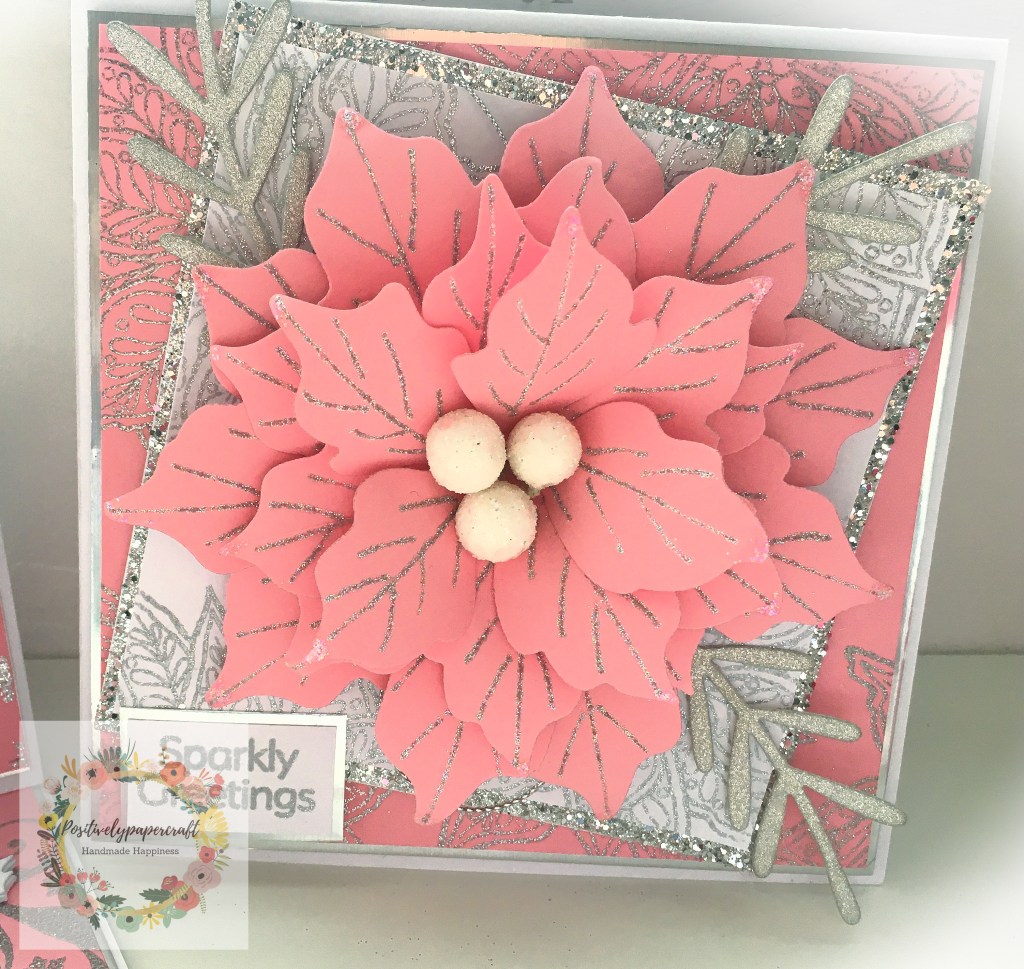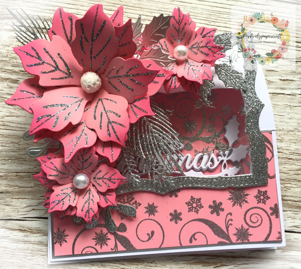 I made a 6 x 6″ acetate easel card using the gorgeous large layering dies. The card was decorated with positively poinsettia and some beautiful Christmas foliage dies. I just think the pink looks so elegant especially with the silver.