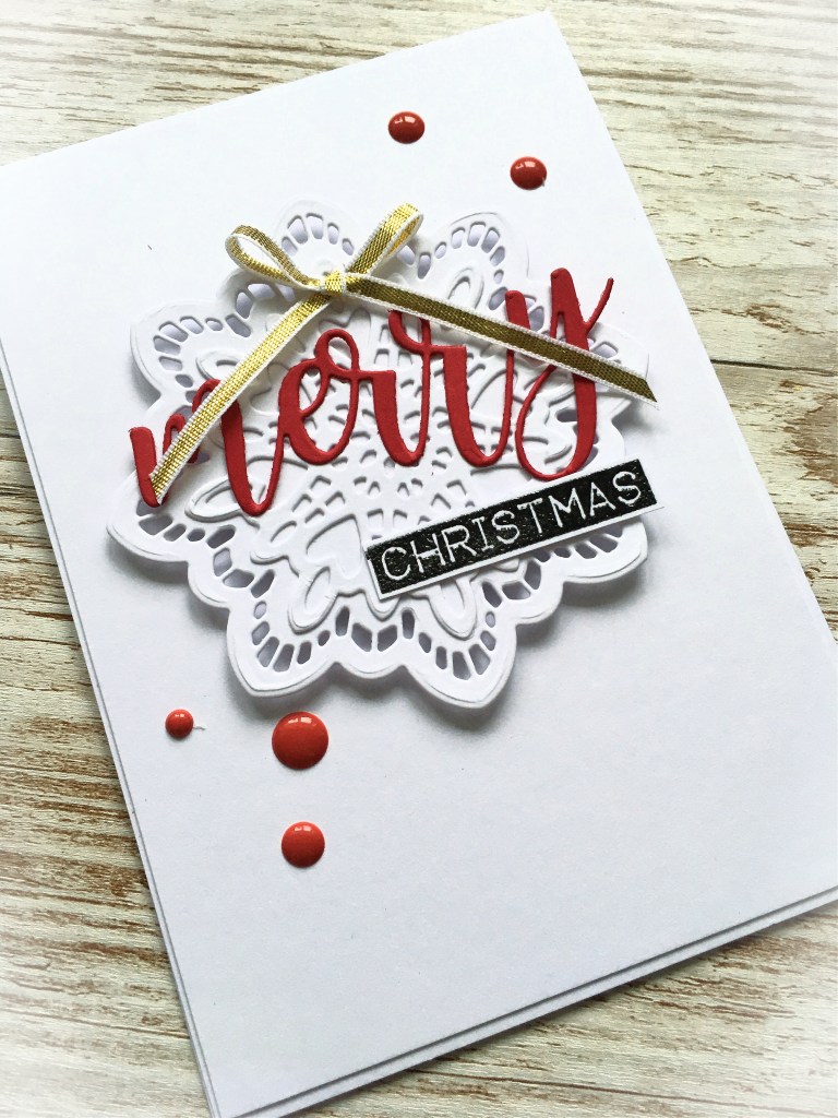 I love this card! I think the black, white and Red look so good together. Again, so simple but so effective. I used my favourite snowflake die. This card measures 4 1/8 x 5 7/8″ and the card front measures 4 x 5 3/4″