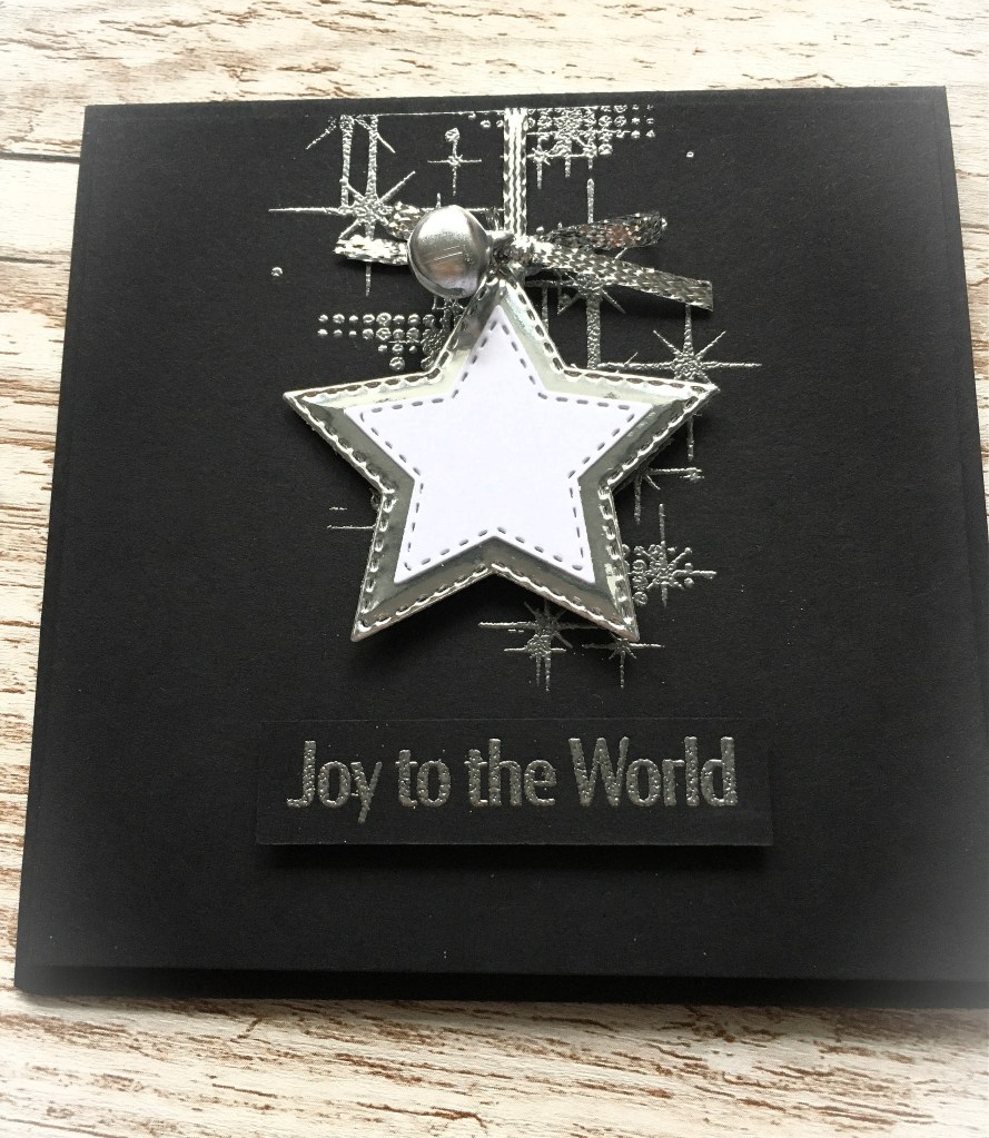 Another 4 x 4″ card. I really love this, it’s so simple but also quite elegant. I used the beautiful star stamps again. I added a simple star, ribbon and a little bell.