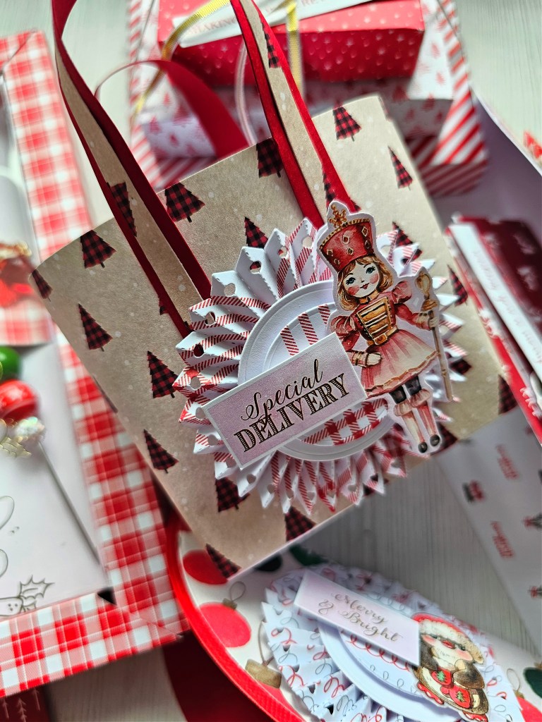 So we made bag toppers, mini handbag, flat gift bag , trio of boxes and a shadow box gift box. My favourite is the shadow box gift box, I love that and also the bag toppers are so cute!